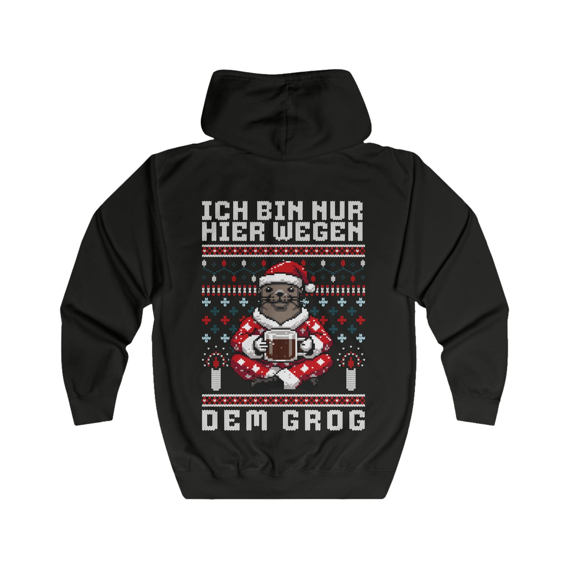 Diese kuschelige Zipperjacke im Strickmuster-Look bringt norddeutschen Grog-Humor in die Winterzeit – mit pixeligem Seehund und frechem Weihnachtsspruch.
