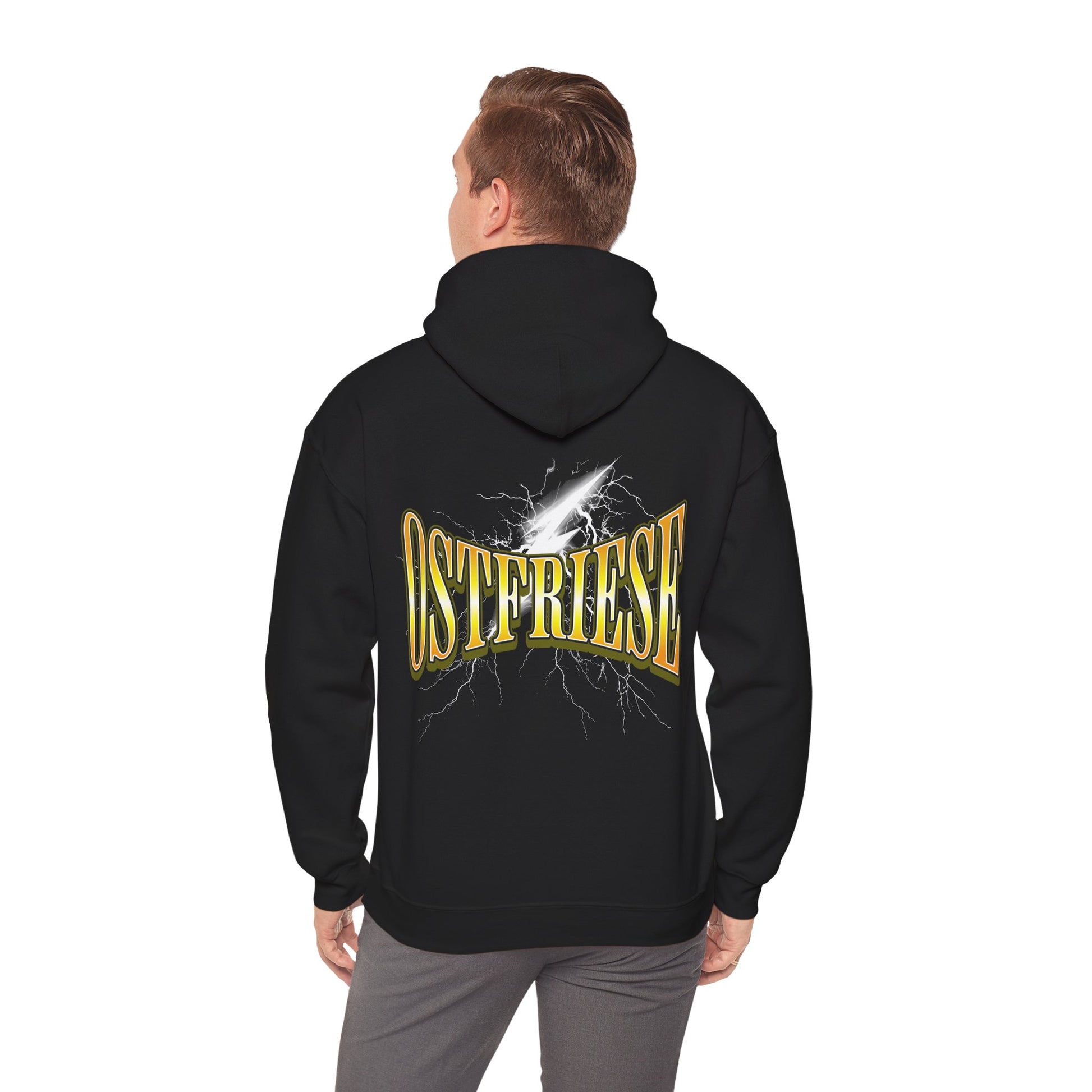 Dieser Hoodie ist kein Kleidungsstück – er ist ein Statement. Mit goldglänzendem OSTFRIESE-Schriftzug, dramatischem Blitzmotiv und tiefschwarzem Hintergrund bringt er norddeutsche Power auf den Punkt. Perfekt für alle, die klare Kante zeigen und stolz auf ihre Heimat sind.